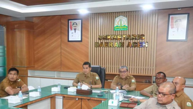 Kepala Pelaksana Badan Penanggulangan Bencana Aceh (BPBA), Ir. Bahron Bakti, ST., MT, didampingi jajaran pejabat struktural BPBA, mengikuti rapat koordinasi siaga bencana hidrometeorologi secara daring yang dipimpin Sekretaris Daerah (Sekda) Aceh, M. Nasir, S.IP., MPA, bersama unsur Basarnas dan BMKG. Rapat tersebut berlangsung di ruang rapat Sekda Aceh, Senin (13/4).