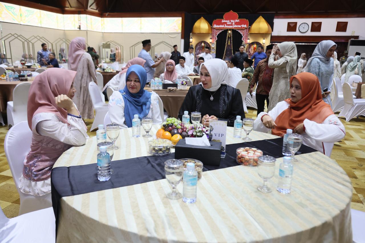 Banda Aceh – Ketua TP PKK Aceh Marlina Muzakir, menyambut kedatangan Staf Ahli TP PKK Aceh Mukarramah Fadhlullah , Sekretaris Daerah Aceh M Nasir beserta Ketua Dharma Wanita Persatuan Aceh Malahayati serta ribuan masyarakat, pada Halal bi Halal dan Silaturrahmi Hari Raya Idul Fitri 1447 Hijriah, di Anjong Mon Mata komplek Meuligoe Gubernur Aceh, Sabtu (21/3/2026).