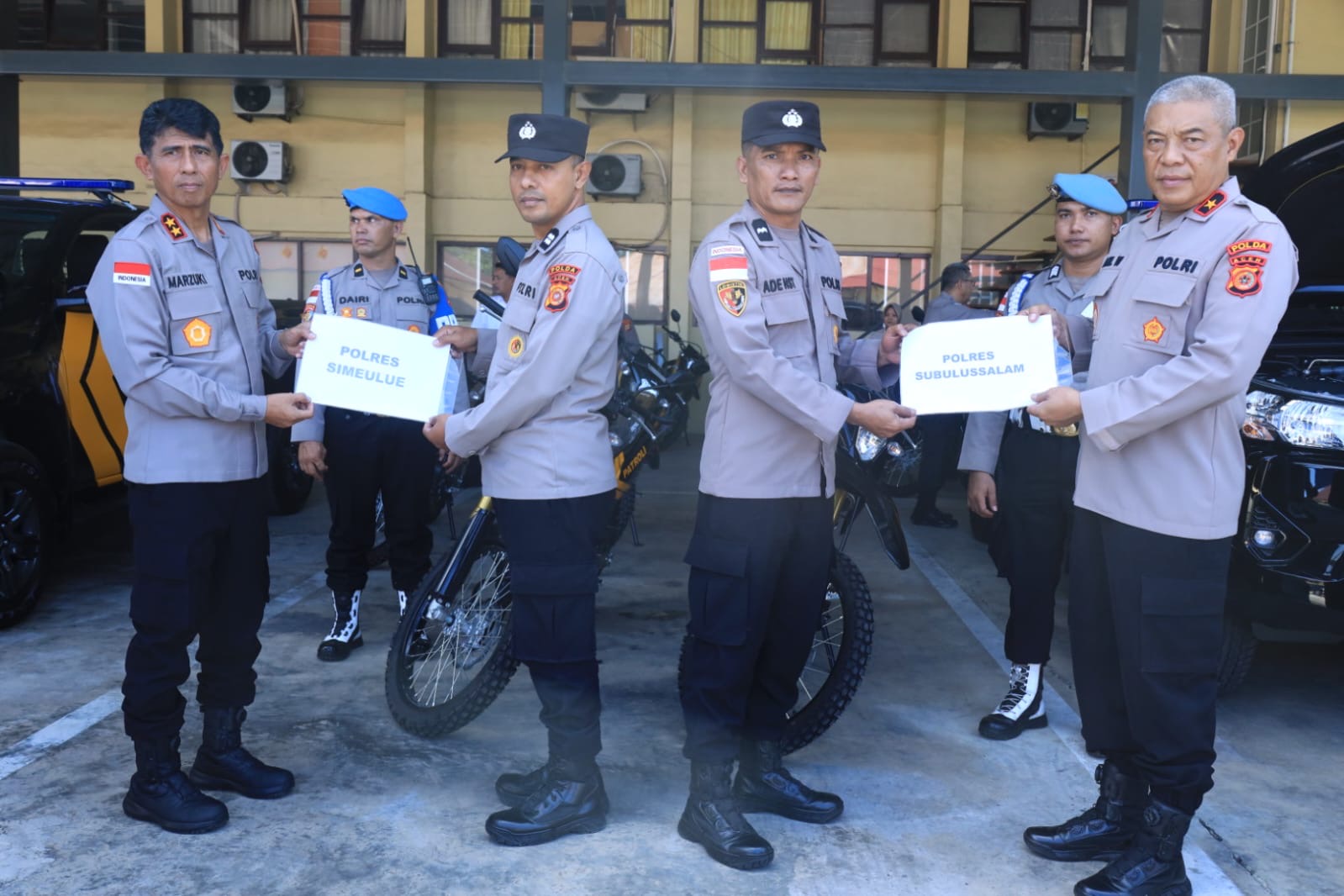 Banda Aceh — Kapolda Aceh Irjen Pol. Drs. Marzuki Ali Basyah, M.M., menyalurkan secara simbolis bantuan kendaraan dinas berupa mobil dan sepeda motor dari Kapolri kepada Polres Subulussalam dan Polres Simeulue.