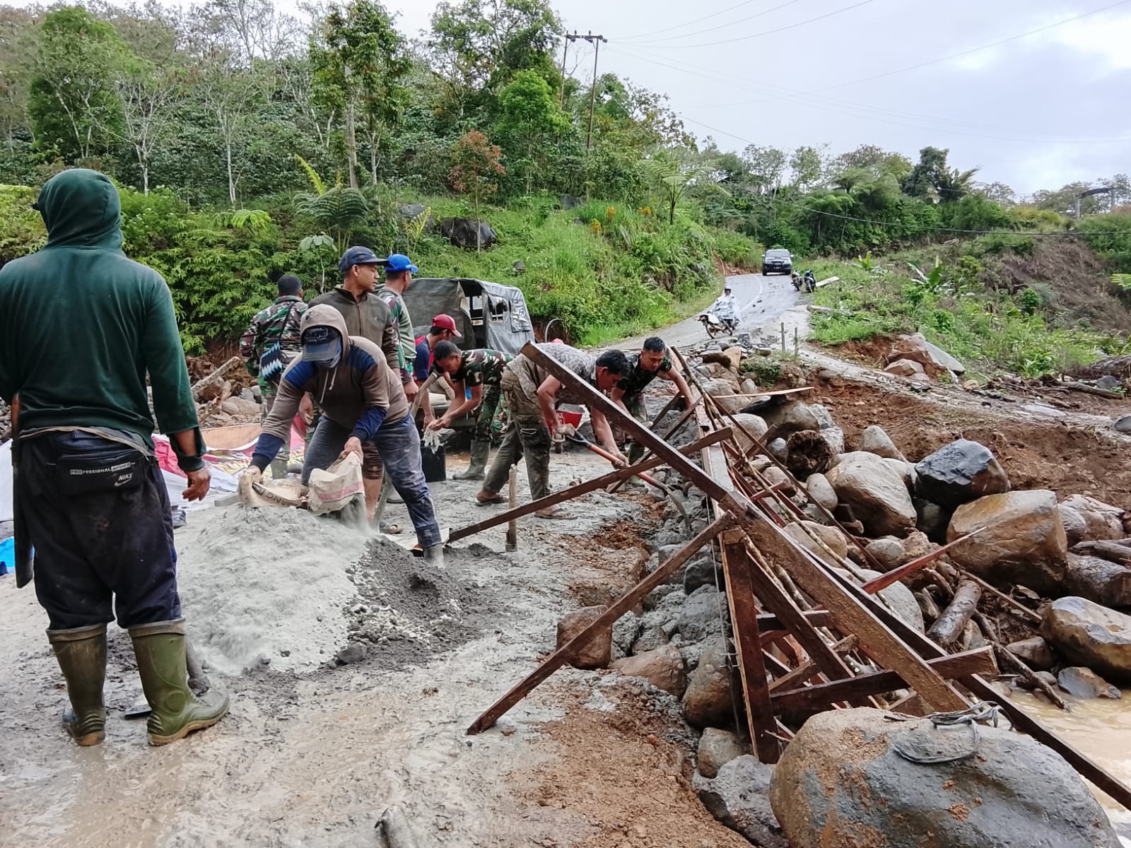 TNI Bersama Warga Lanjutkan Pengecoran Tembok Penahan Jembatan Aramco di Bener Meriah